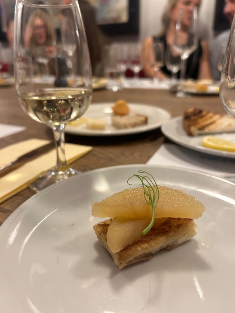 Following that, we tried a sparkling rosé, a deep-bodied red, and finished off with a dessert wine, all whilst learning about the history of each bottle and the vinification process. Each glass was paired with food, but these were not your typical bar snacks. Instead, we were served carefully chosen dishes that contained flavours which would complement each blend, from toast coated in a golden butter and a sprinkle of salt, to a sweet apple madeleine, both of which were kindly altered to cater to my gluten allergy.