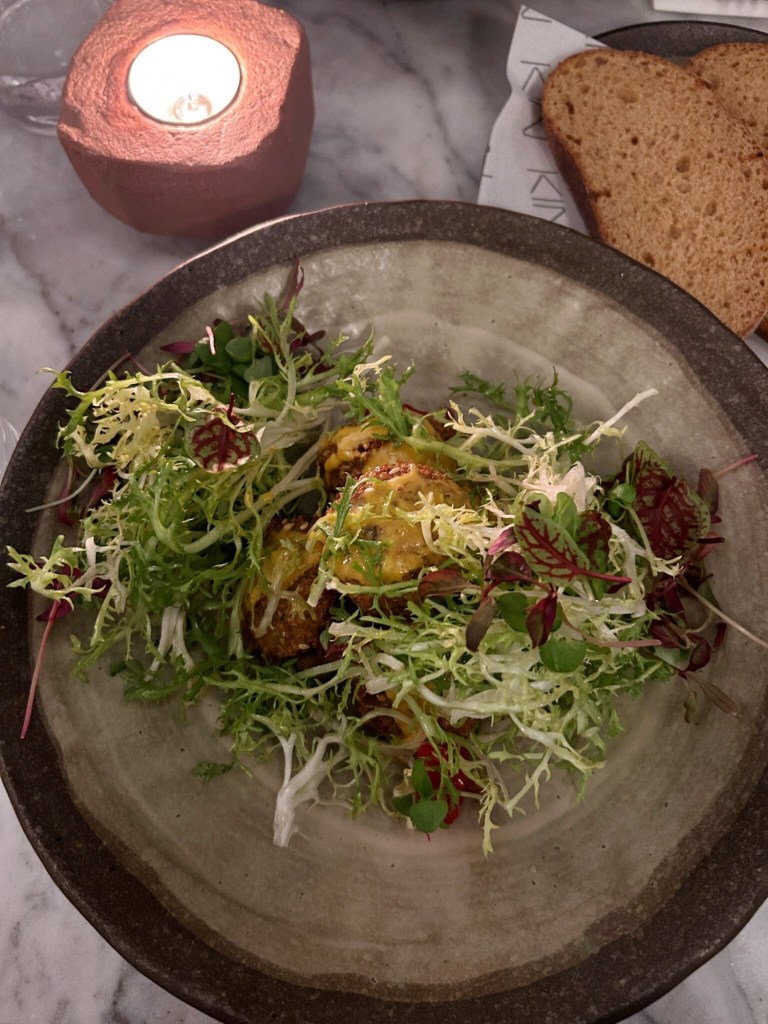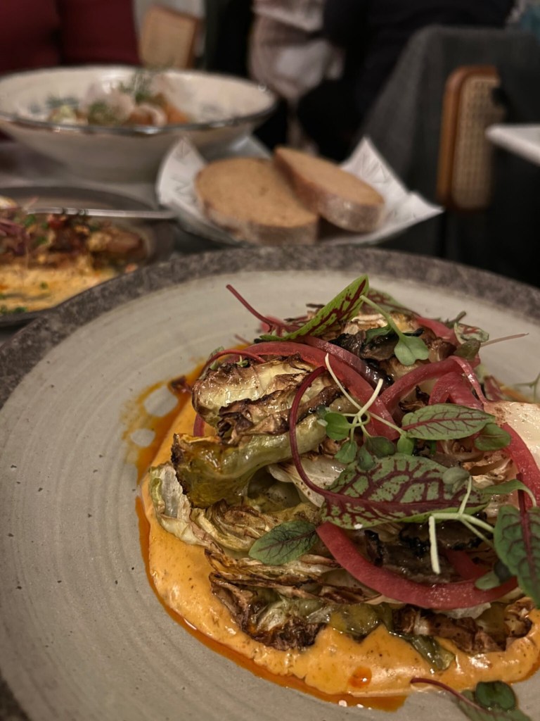 One by one, our dishes were presented, the first being the fried aubergine. It arrived drenched in a creamy signature sauce and sprinkled with crispy garlic- a burst of flavours and textures that perfectly complemented one another. The hummus followed, a carrot and chickpea dip with truffle oil drizzled on top and a side of gluten free bread upon request. Next were the broadbean croquettes, a personal favourite of ours. Sat on a butter bean and dill cream bedding, the crunchy, golden coating broke into a soft yet dense interior- a true delight to the tastebuds. Our final small plate was the cabbage, charred to perfection with a light ponzu glaze, a creamy base and a pickled red onion topping. Needless to say, this was another stand-out dish for us.