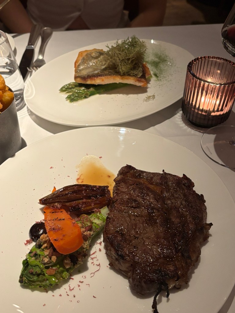 To start, we opted for the hot smoked salmon on a bed of fennel cream, served with a hen’s egg, herring roe and a mound of crispy Alexander on top. We couldn’t resist the Oysters & Caviar section of the menu, so opted for a half a dozen Rockefeller oysters, served on an elegant stainless steel platter with apple balsamic vinegar to drizzle on top. Next up was the grilled John Dory, sat on a bed of asparagus and a buttery sauce of brown shrimps and mussels to drizzle on top. With our fresh seafood cravings sufficiently satisfied, we thought it time to try the true star of the show- the meat.